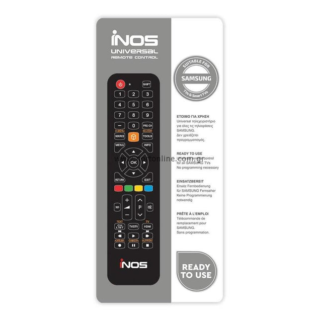 Universal Τηλεχειριστήριο inos για Τηλεοράσεις SAMSUNG απλές & Smart παραγωγής μετά απο το 2000. Λειτουργεί με 2 μπαταρίες AAA, διαθέτει ισχυρό σήμα ενώ δεν απαιτείται προγραμματισμός. Διαθέτει μεγάλα πλήκτρα για περισσότερη άνεση.